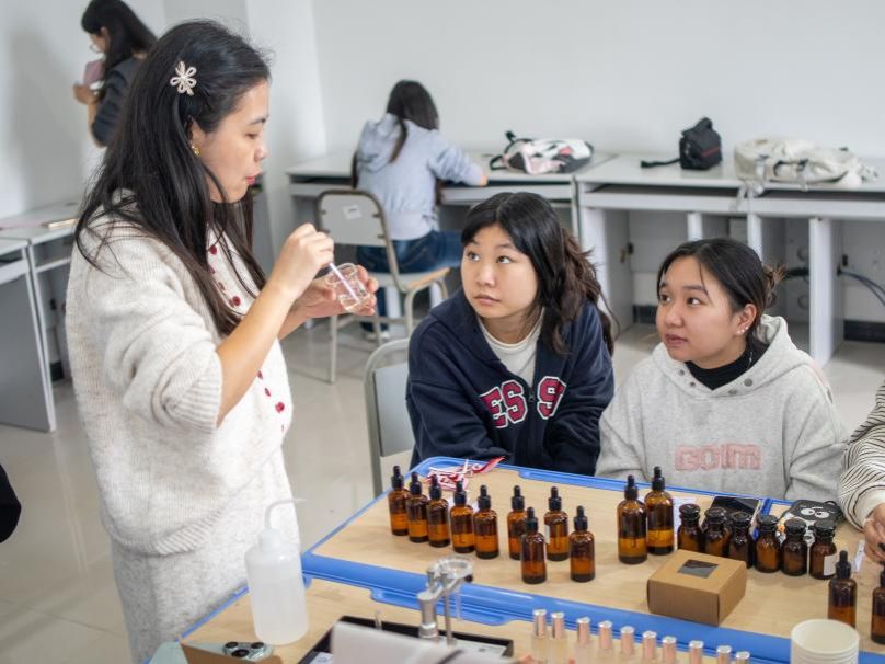 (图为张思思老师指导学生进行调香操作,学生专注完成香水调配)