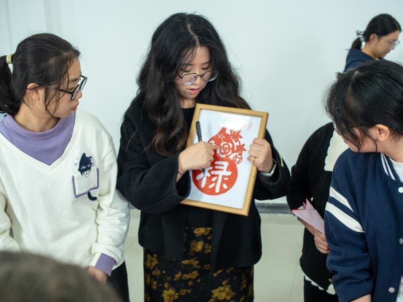 活动现场设置两大核心体验环节,以沉浸式体验让学生感受非遗技艺的独特魅力。在剪纸体验环节,青海省格尔木市第四代非遗剪纸传承人母雯欣同学受邀担任主讲人。母雯欣同学首先系统讲解剪纸文化的历史渊源、分类标准及不同派系的艺术特征,结合自身传承非遗的经历,用生动案例让学生对剪纸文化有了全面认知;随后,她聚焦实践操作,细致拆解纸张折叠角度、图案勾画技巧、剪刀与刻刀工具配合等基础步骤,通过手把手示范,帮助学生掌握剪纸技艺的核心要点。在动手实践环节,同学们充分发挥创意,按照所学技巧构思、创作剪纸作品,完成后主动展示分享,在裁剪与创作的过程中,深刻体会到剪纸传统技艺的精妙之处与蕴含的文化内涵。