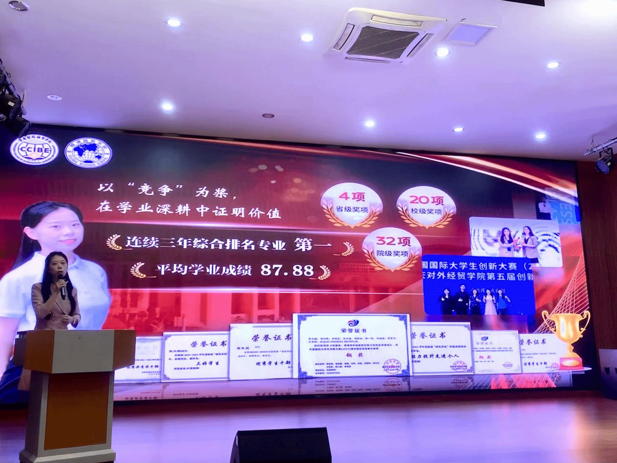 在分享环节中,跨境商务学院五位优秀学子代表依次登台,结合各自的学习与成长历程,围绕学习规划、科研竞赛、社会实践等多个方面展开生动分享。他们以真挚的语言、坚定的信念,深情讲述了个人奋斗历程与感悟体会,深刻诠释了新时代青年学子勇于拼搏的精神风貌与使命担当,深深感染了在场师生,现场掌声不断、反响热烈。