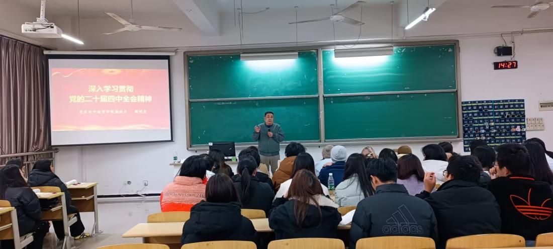 在专题宣讲环节,周明星副校长走进铜梁校区2406教室,以专题授课形式向学生系统解读党的二十届四中全会精神。课堂上,他立足新时代高校思想政治教育工作要求,紧密结合社会发展热点与学校应用型办学定位,凭借扎实的理论功底和鲜活的实践案例,深入浅出地阐释了全会精神的核心要义、实践要求以及对青年学子成长成才的指引意义。整堂课逻辑严谨、内涵丰富、感染力强,有效推动全会精神入脑入心,赢得在场同学们的一致好评。